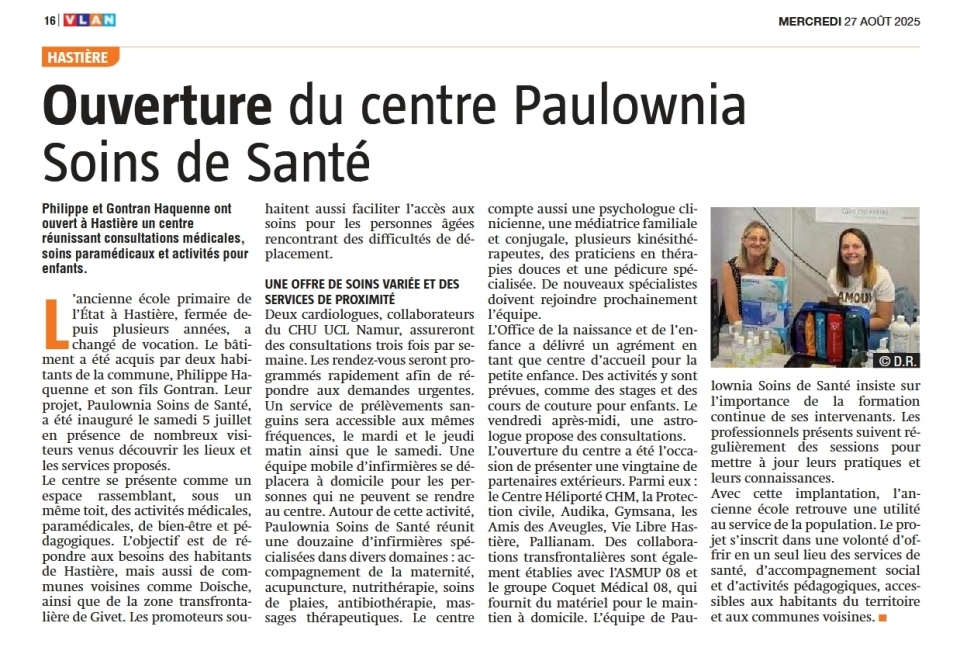 Hastière : ouverture du centre Paulownia Soins de Santé Philippe et Gontran Haquenne ont ouvert à Hastière un centre réunissant consultations médicales, soins paramédicaux et activités pour enfants. L'ancienne école primaire de l'État à Hastière, fermée depuis plusieurs années, a changé de vocation. Le bâtiment a été acquis par deux habitants de la commune, Philippe Haquenne et son fils Gontran. Leur projet, Paulownia Soins de Santé, a été inauguré le samedi 5 juillet 2025 en présence de nombreux visiteurs venus découvrir les lieux et les services proposés. Le centre se présente comme un espace rassemblant, sous un même toit, des activités médicales, paramédicales, de bien-être et pédagogiques. L'objectif est de répondre aux besoins des habitants de Hastière, mais aussi de communes voisines comme Doische, ainsi que de la zone transfrontalière de Givet. Les promoteurs souhaitent aussi faciliter l'accès aux soins pour les personnes âgées rencontrant des difficultés de déplacement. UNE OFFRE DE SOINS VARIÉE ET DES SERVICES DE PROXIMITÉ Deux cardiologues, collaborateurs du CHU UCL Namur, assureront des consultations trois fois par semaine. Les rendez-vous seront programmés rapidement afin de répondre aux demandes urgentes. Un service de prélèvements sanguins sera accessible aux mêmes fréquences, le mardi et le jeudi matin ainsi que le samedi. Une équipe mobile d'infirmières se déplacera à domicile pour les personnes qui ne peuvent se rendre au centre. Autour de cette activité, Paulownia Soins de Santé réunit une douzaine d'infirmières spécialisées dans divers domaines: accompagnement de la maternité, acupuncture, nutrithérapie, soins de plaies, antibiothérapie, massages thérapeutiques. Le centre compte aussi une psychologue clinicienne, une médiatrice familiale et conjugale, plusieurs kinésithérapeutes, des praticiens en thérapies douces et une pédicure spécialisée. De nouveaux spécialistes doivent rejoindre prochainement l'équipe. L'Office de la naissance et de l'enfance a délivré un agrément en tant que centre d'accueil pour la petite enfance. Des activités y sont prévues, comme des stages et des cours de couture pour enfants. Le vendredi après-midi, une astrologue propose des consultations. L'ouverture du centre été l'occasion de présenter une vingtaine de partenaires extérieurs. Parmi eux : le Centre Héliporté CHM, la Protection civile, Audika, Gymsana, les Amis des Aveugles, Vie Libre Hastière, Pallianam. Des collaborations transfrontalières sont égale ment établies avec l'ASMUP 08 et le groupe Coquet Médical 08, qui fournit du matériel pour le maintien à domicile. L'équipe de Paulownia Soins de Santé insiste sur l'importance de la formation continue de ses intervenants. Les professionnels présents suivent régulièrement des sessions pour mettre à jour leurs pratiques et leurs connaissances. Avec cette implantation, l'ancienne école retrouve une utilité au service de la population. Le projet s'inscrit dans une volonté d'offrir en un seul lieu des services de santé, d'accompagnement social et d'activités pédagogiques, accessibles aux habitants du territoire et aux communes voisines.